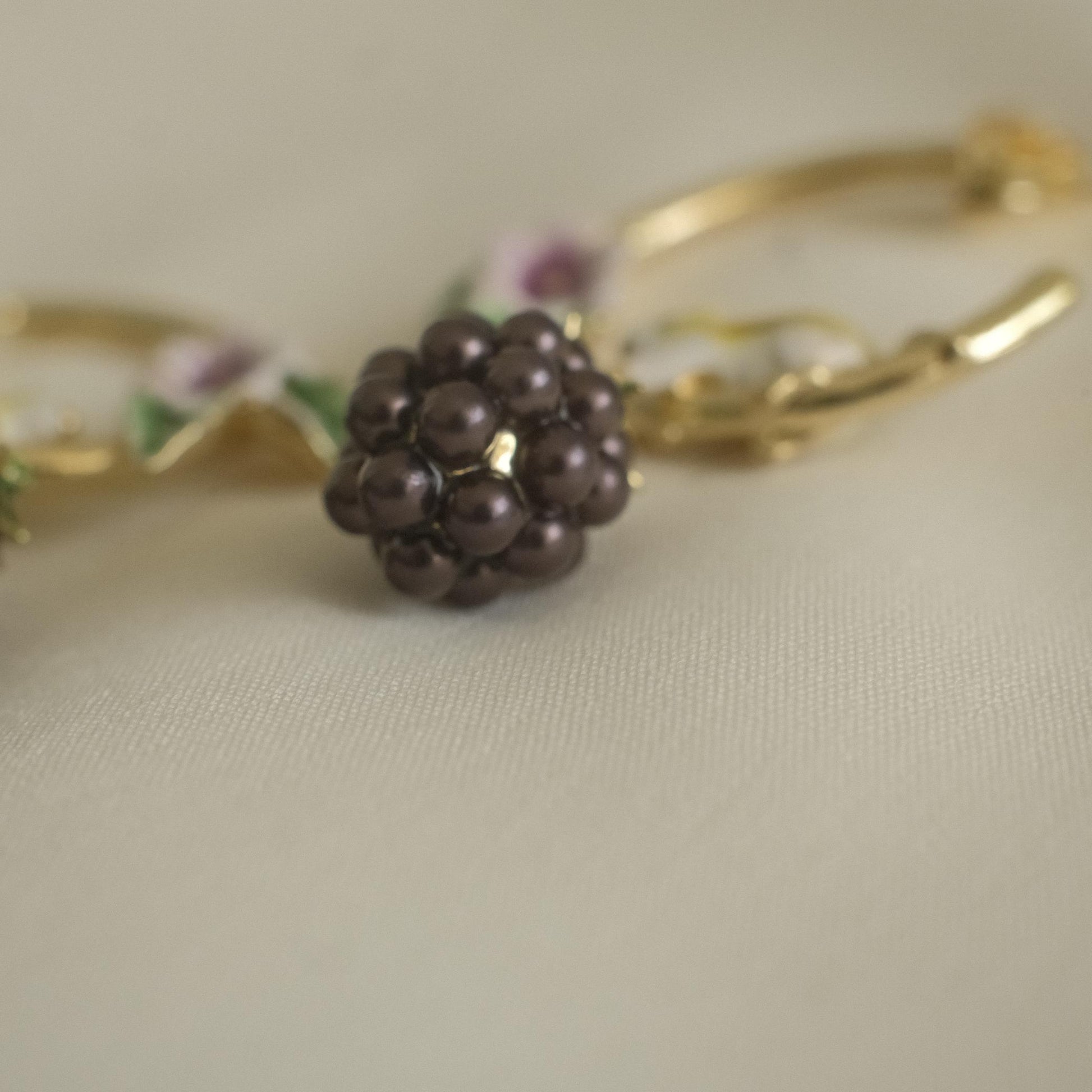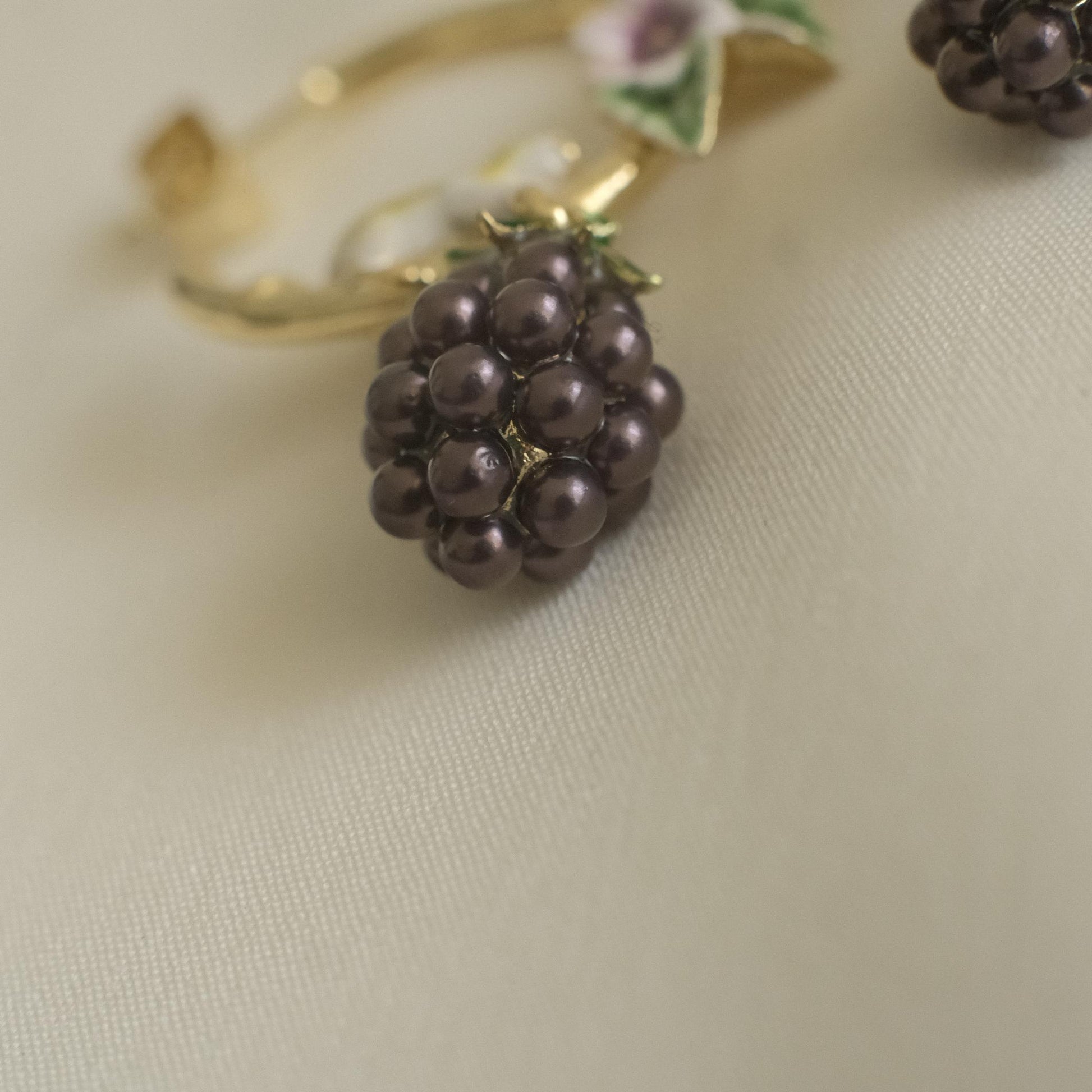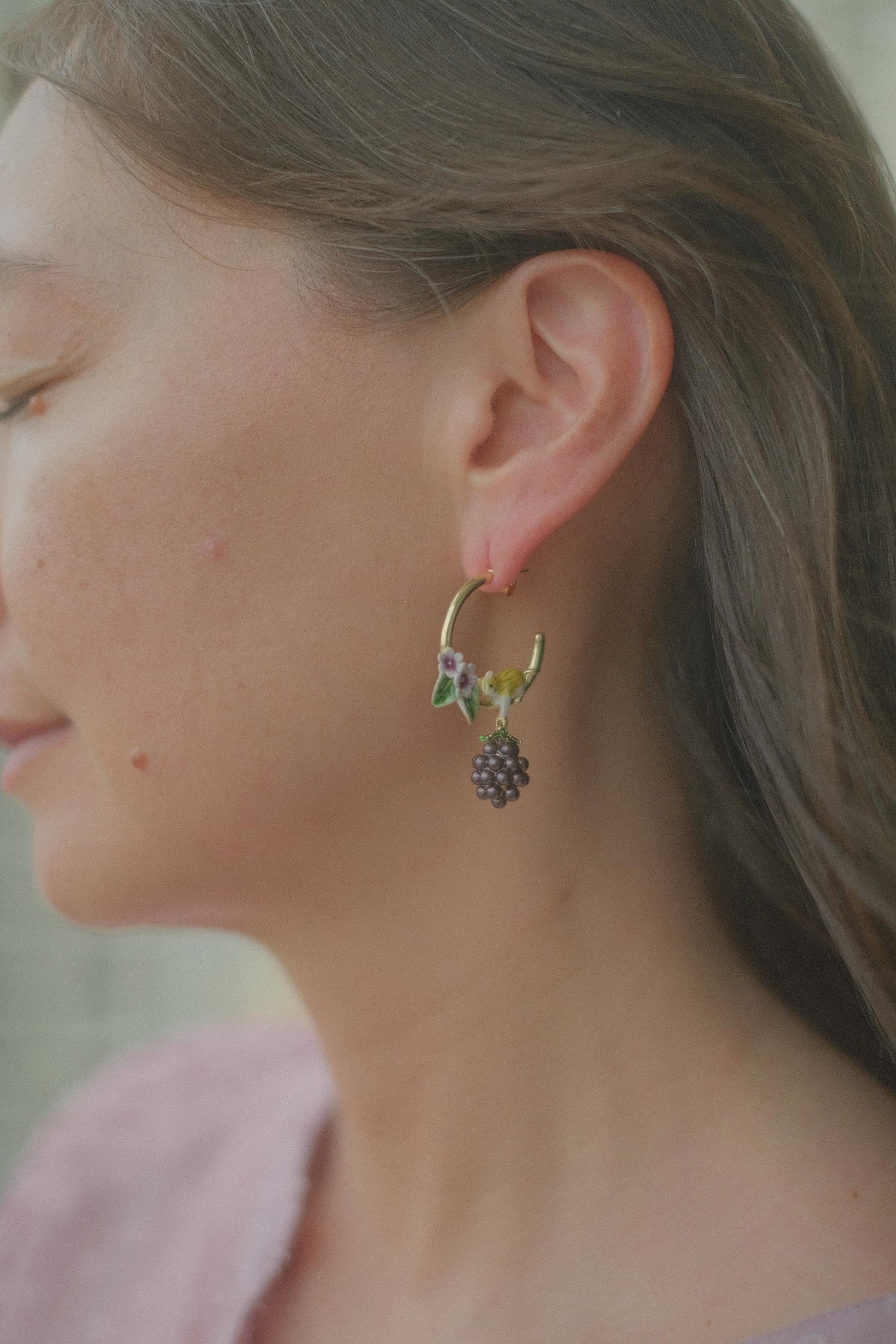 These hoop earrings feature a small mouse and blackberry motif, brought to life through carefully applied enamel detailing.